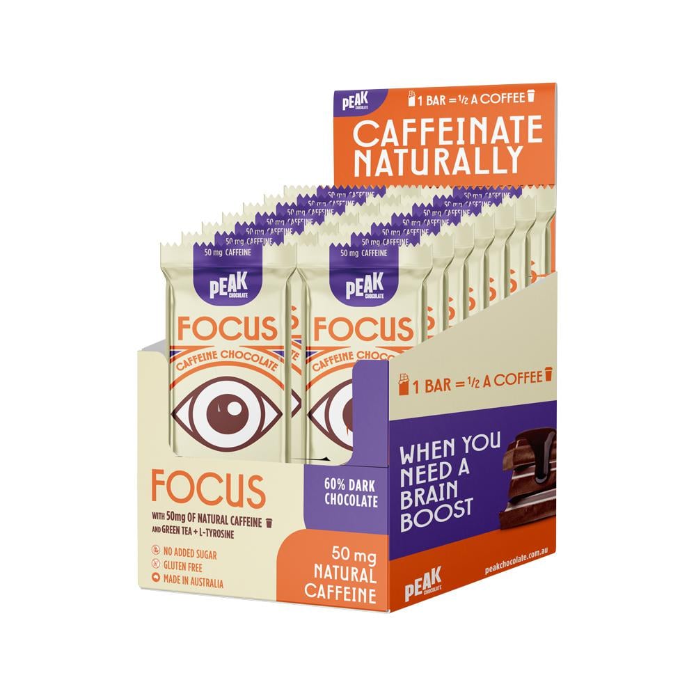 PEAK CHOCOLATE CAFFEINE CHOCOLATE BAR FOCUS DARK 25G X 14 DISPLAY