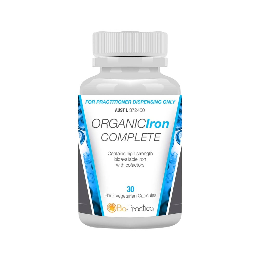 Introducing Bio-Practica ORGANIC Iron COMPLETE 30c, your go-to solution for high strength, bioavailable iron. Formulated with gut-friendly iron bisglycinate and essential cofactors, this supplement is designed to enhance iron absorption, utilization, and energy production. Ideal for women of childbearing age and those on a plant-based diet, it may assist in managing dietary iron insufficiency.
