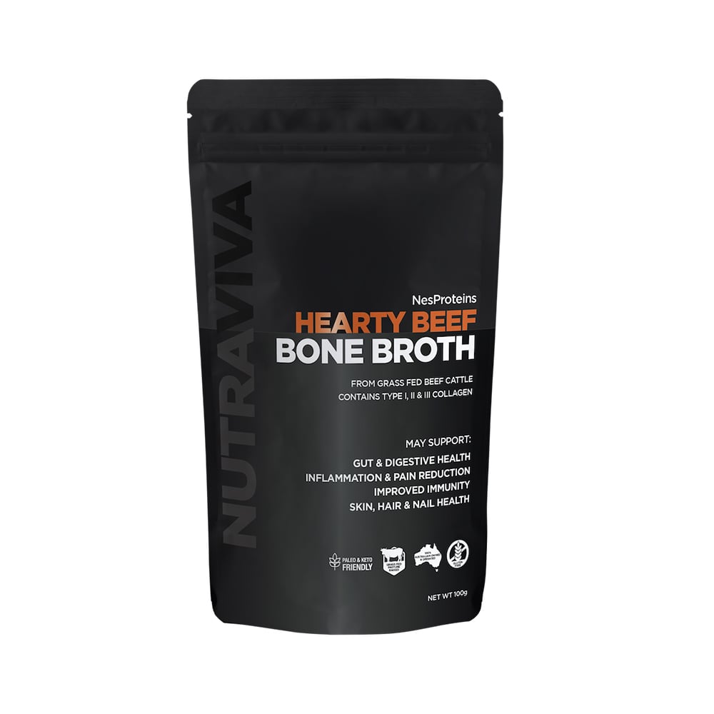 Discover the power of Nutraviva Bone Broth Hearty Beef, a nutrient-rich blend crafted for convenience and health. Made from all-natural ingredients sourced from pasture-raised Australian and New Zealand beef cattle bones, this broth is packed with three types of collagen to boost immunity and gut health.
