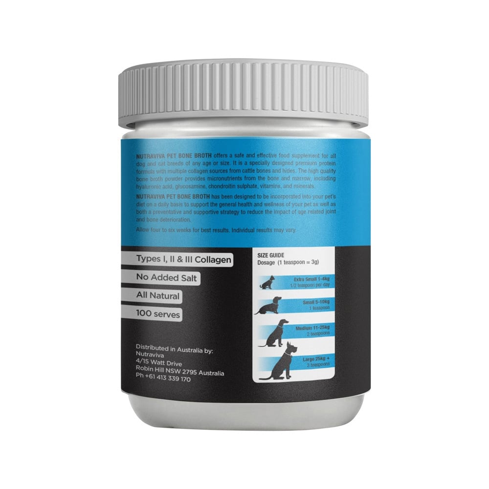 Elevate your pet's health with Nutraviva Pet Bone Broth. This premium protein formula is designed for dogs and cats of all breeds, ages, and sizes. Packed with 100% natural ingredients, it offers: