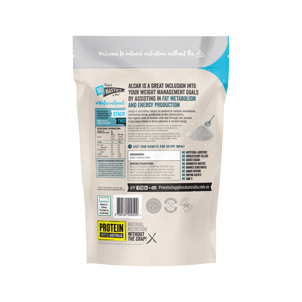 Unlock your potential with Protein Supplies Australia (Clean) ALCAR Pure 200g. This powerful Acetyl-L-Carnitine supplement plays a vital role in cellular metabolism, enhancing energy production right in your mitochondria. Experience a boost in both physical and mental energy, perfect for powering through workouts or staying sharp throughout the day.